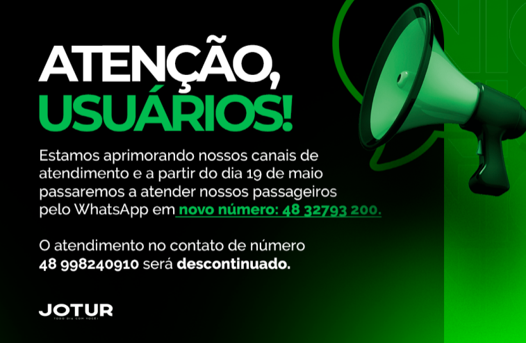 Para aprimorar o atendimento, a Jotur implementará o número (48) 3279-3200 como novo canal oficial no WhatsApp. O objetivo é tornar o contato mais eficiente e centralizado para os usuários.
